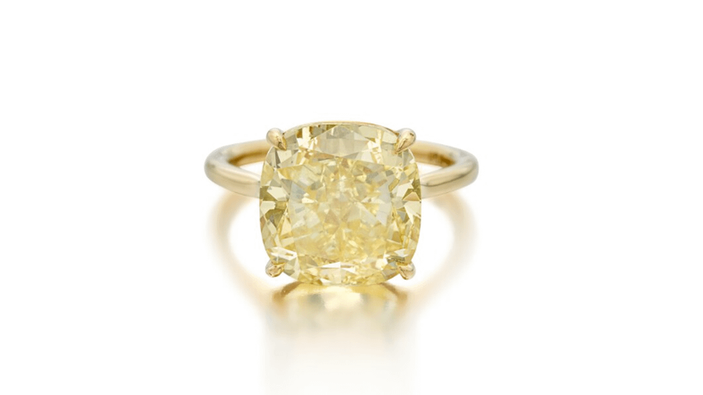 Кольцо от Valentin Magro с бриллиантом огранки кушон, весом 7,71 карата, фантазийного интенсивно-желтого цвета, чистоты VS2 было продано за $ 101 600, в пределах оценок.