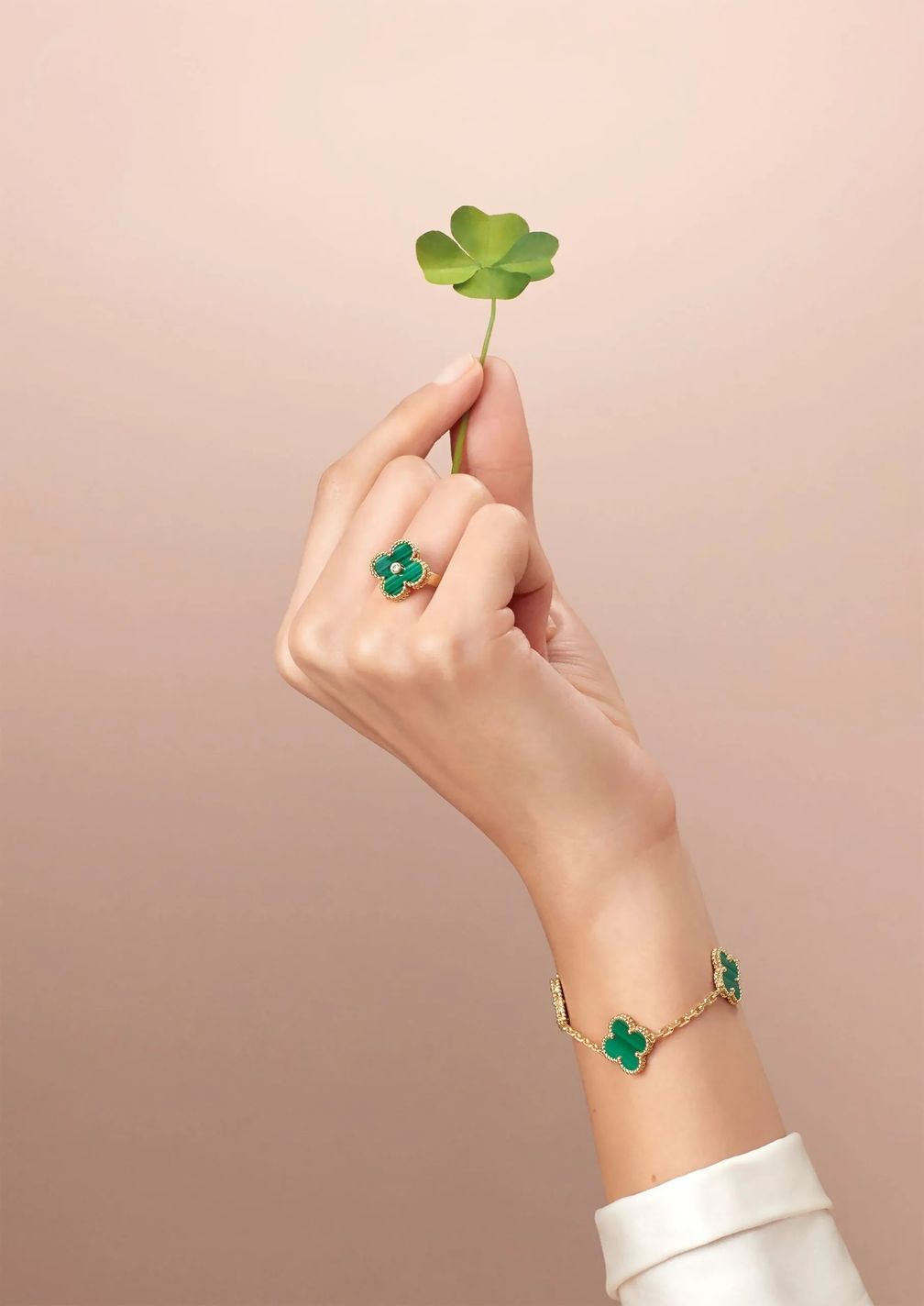 Кольцо Vintage Alhambra и браслет с 5 мотивами из желтого золота и малахита: