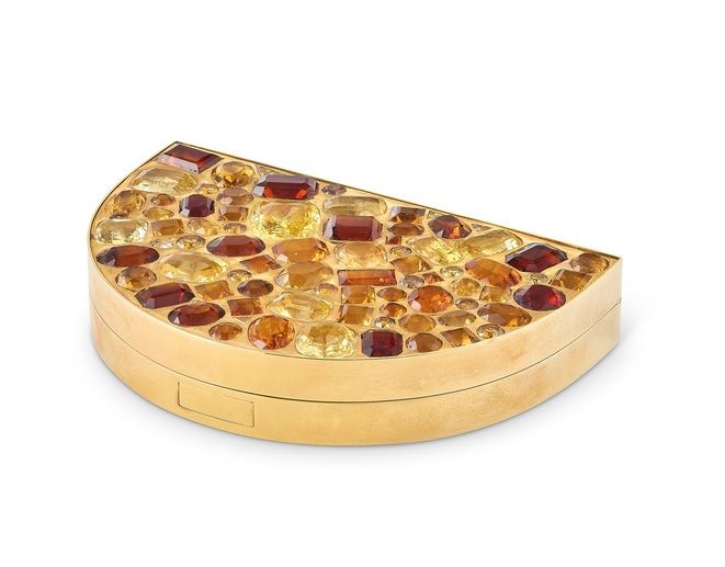 Пудреница с изумрудами, цитрином и цветными бриллиантами от René Boivin, созданная примерно в 1980 году по дизайну Сюзанн Бельперрон:
