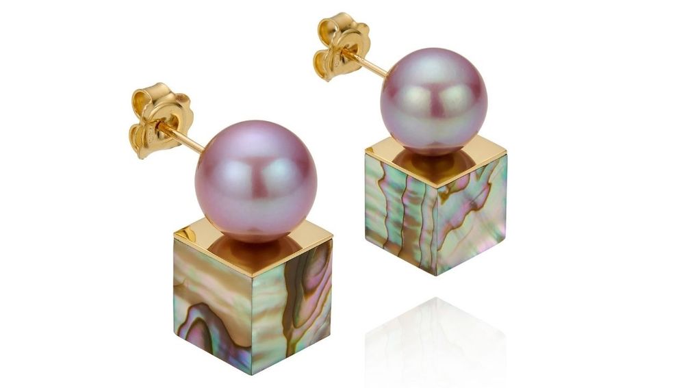 В этом сезоне Георгакопулос представила абалон в своей коллекции Cube, сочетая его с пресноводным жемчугом лавандового цвета, который она тщательно подобрала. Результатом стало скульптурное и современное переосмысление органического материала.