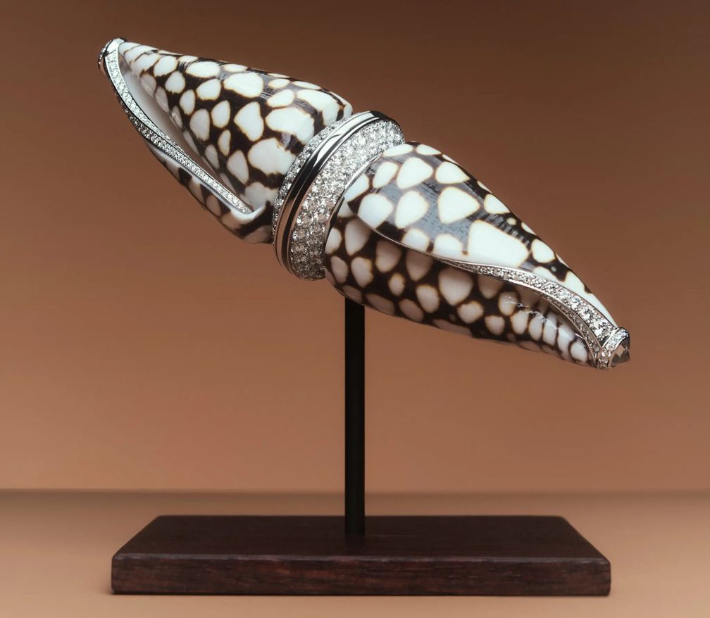 Даже французский Дом Boucheron украсил коричнево-белую мраморную раковину Конус мраморный (conus marmoreus) 286 бриллиантами общим весом 6,54 карата для броши в своей коллекции высокого ювелирного искусства Carte Blanche, состоящей из 26 предметов под названием Ailleurs, представленной в Париже в июле 2022 года.