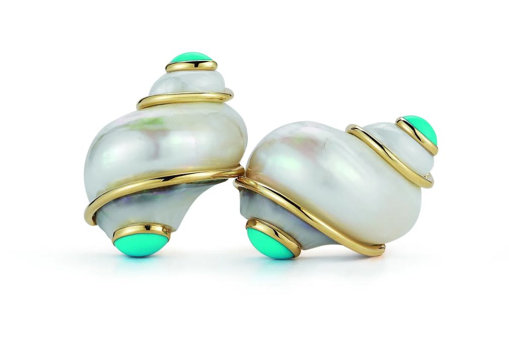 Серьги Seaman Schepps Turbo с золотом и бирюзой. Одноименный ювелир создал эти серьги в 1940-х годах, когда заказчик попросил его превратить пару раковин в серьги:
