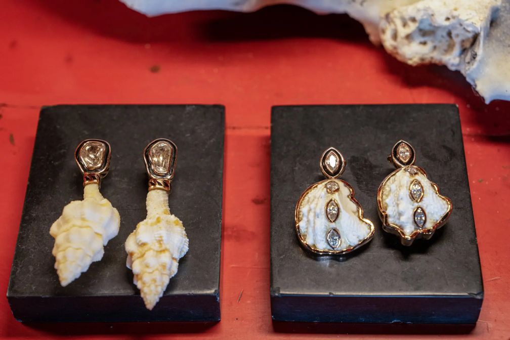 «Я раскладываю все раковины и подбираю к ним драгоценные камни, которые подчеркивают их цвет и рисунок», – говорит Бельтран. Например, каждую из сережек из белой конической раковины она украсила бриллиантом polki весом в один карат в оправе из 18-каратного розового золота; крупную оранжевую раковину моллюска она соединила с трехкаратным цитрином Madeira в колье; а оранжевую пятнистую раковину mitra stictica украсила трехкаратным цитрином огранки изумруд в оправе из 18-каратного розового золота. Цены на ее изделия из раковин варьируются от $ 1700 до $ 20 000 в зависимости от драгоценных камней.