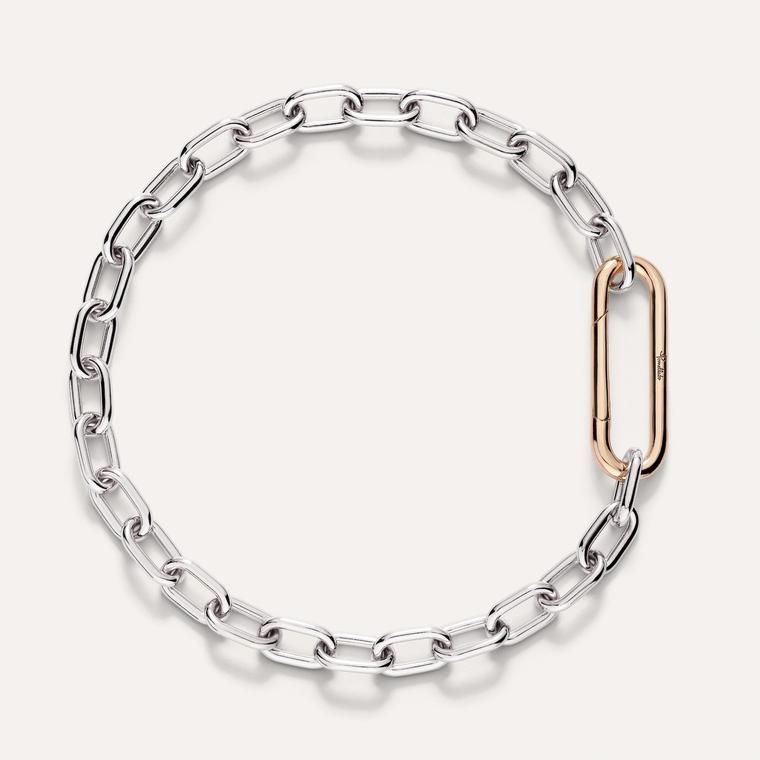 Этот браслет-цепочка Iconica от Pomellato, выполненный из белого и розового золота, подчеркивает уникальную застежку в виде звеньев увеличенного размера, предлагая гендерно нейтральную и минималистичную эстетику: