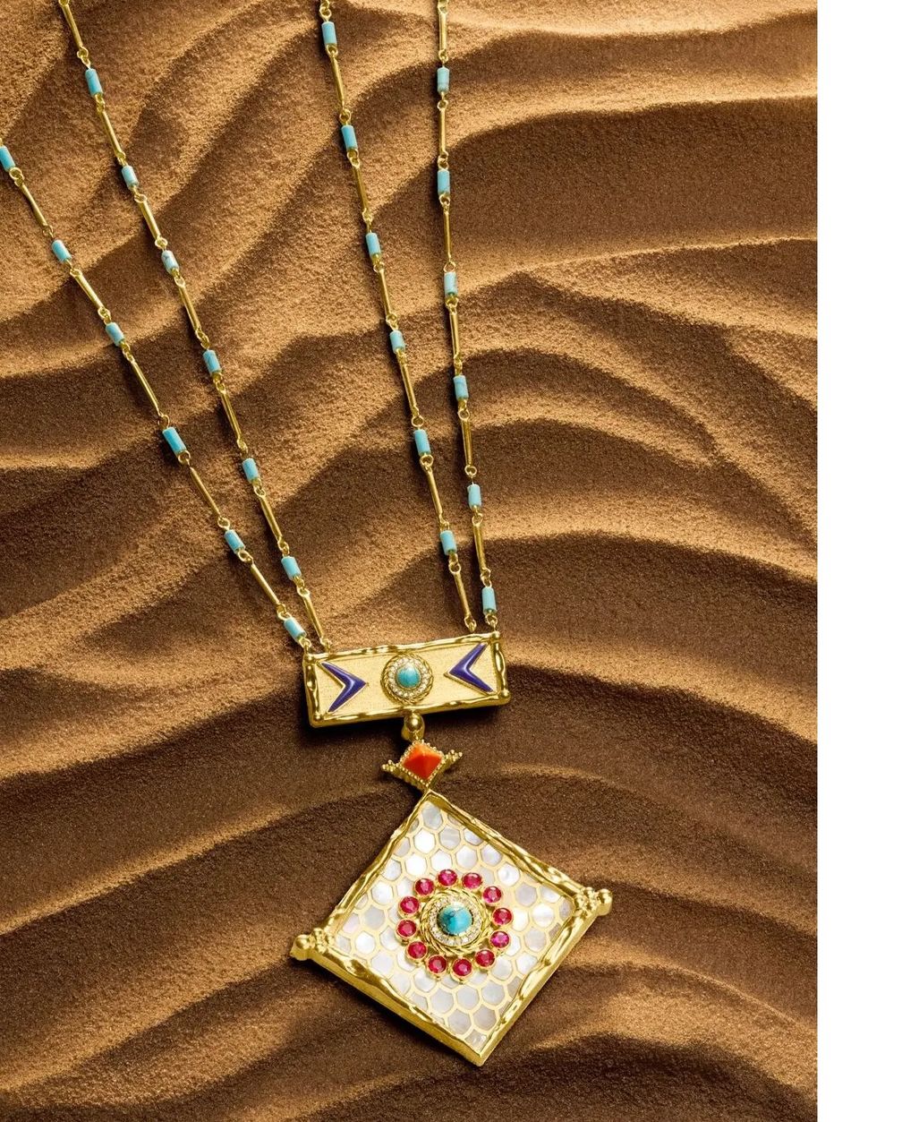 Кулон Мирьям Лабиад из бирюзы, кораллов, ляписа, серых бриллиантов, рубинов-кабошонов с перламутровой инкрустацией (Miryam Labiad):