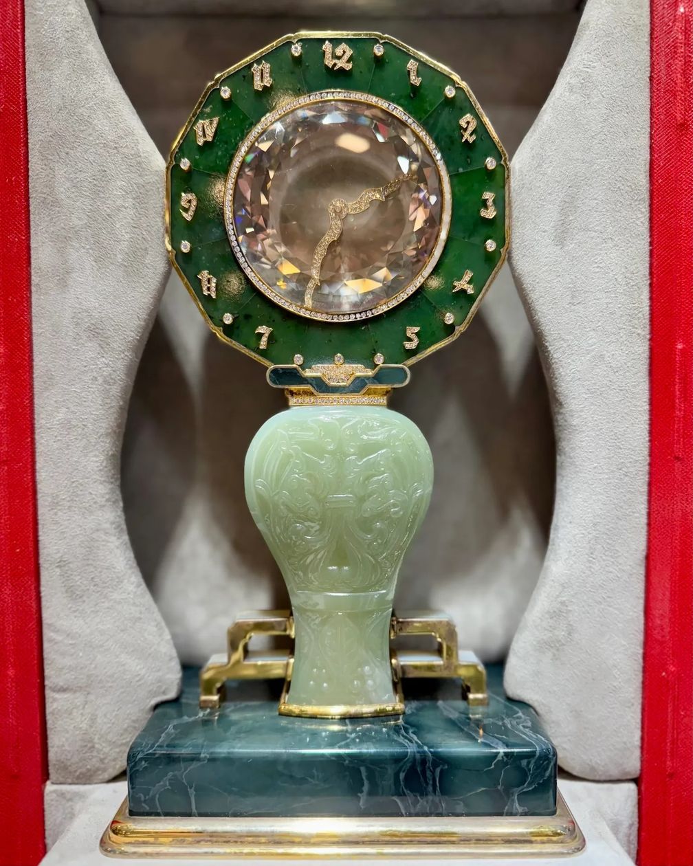 Очень редкие часы Cartier Mystery Clock изготовлены из жадеита, твердого камня и перламутра. Часы украшены бриллиантами и бриллиантовыми стрелками, парящими в горном хрустале. Изготовлено около 1980 года.