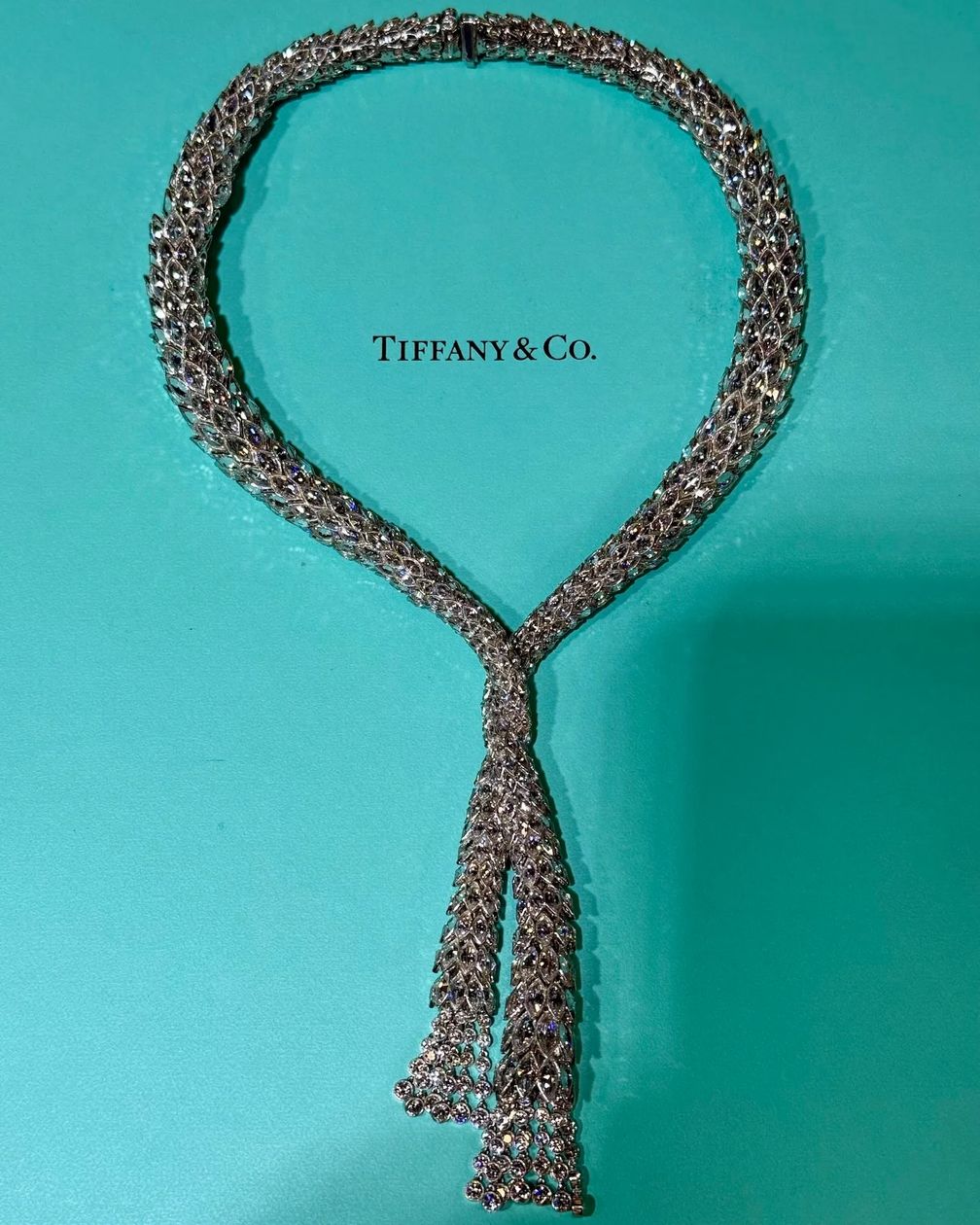 Бриллиантовое колье от Tiffany & Co. украшено бриллиантами огранки маркиз, весом более 142 карат. Этот редкий дизайн был создан в начале 2000-х годов.