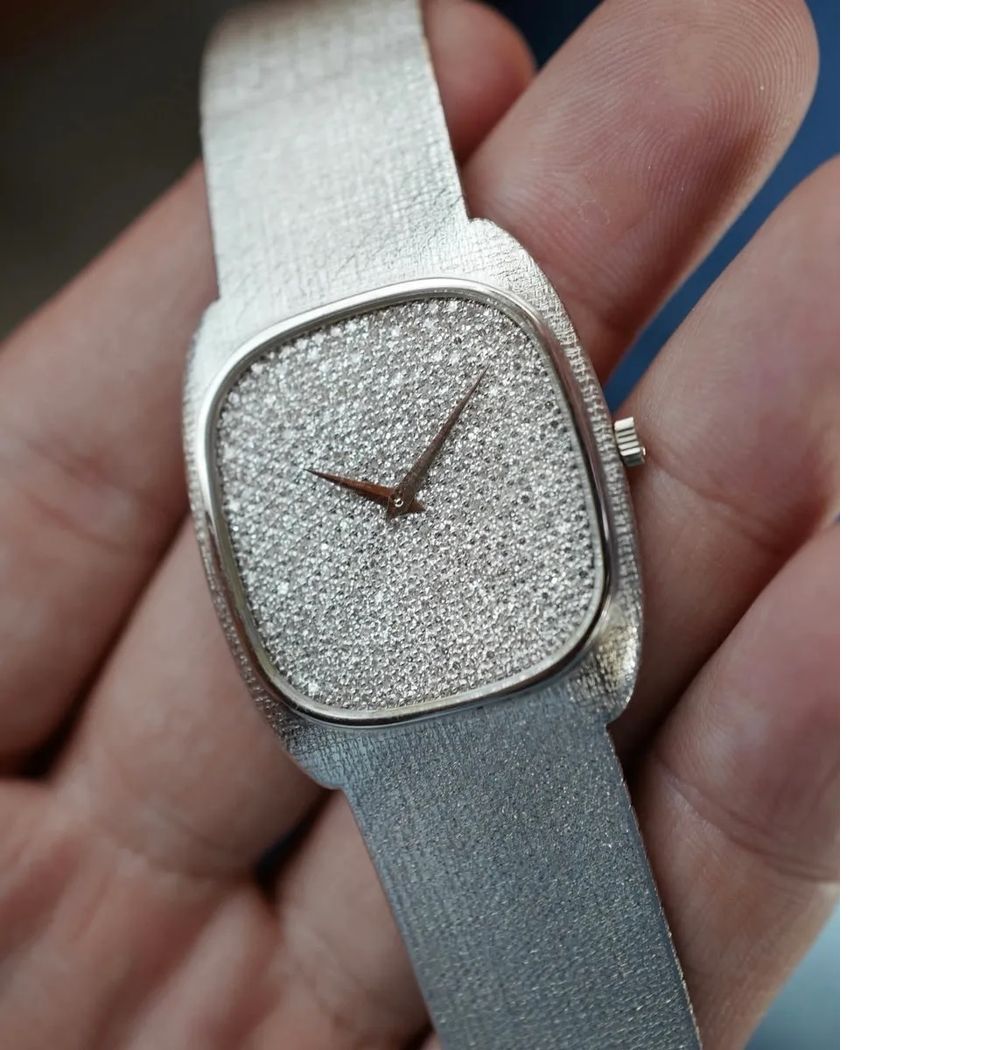 Редкие часы Vacheron Constantin 1970 года изготовлены из 18-каратного белого золота и украшены бриллиантовым циферблатом. Это механические часы с автоподзаводом, референс 2045Q.