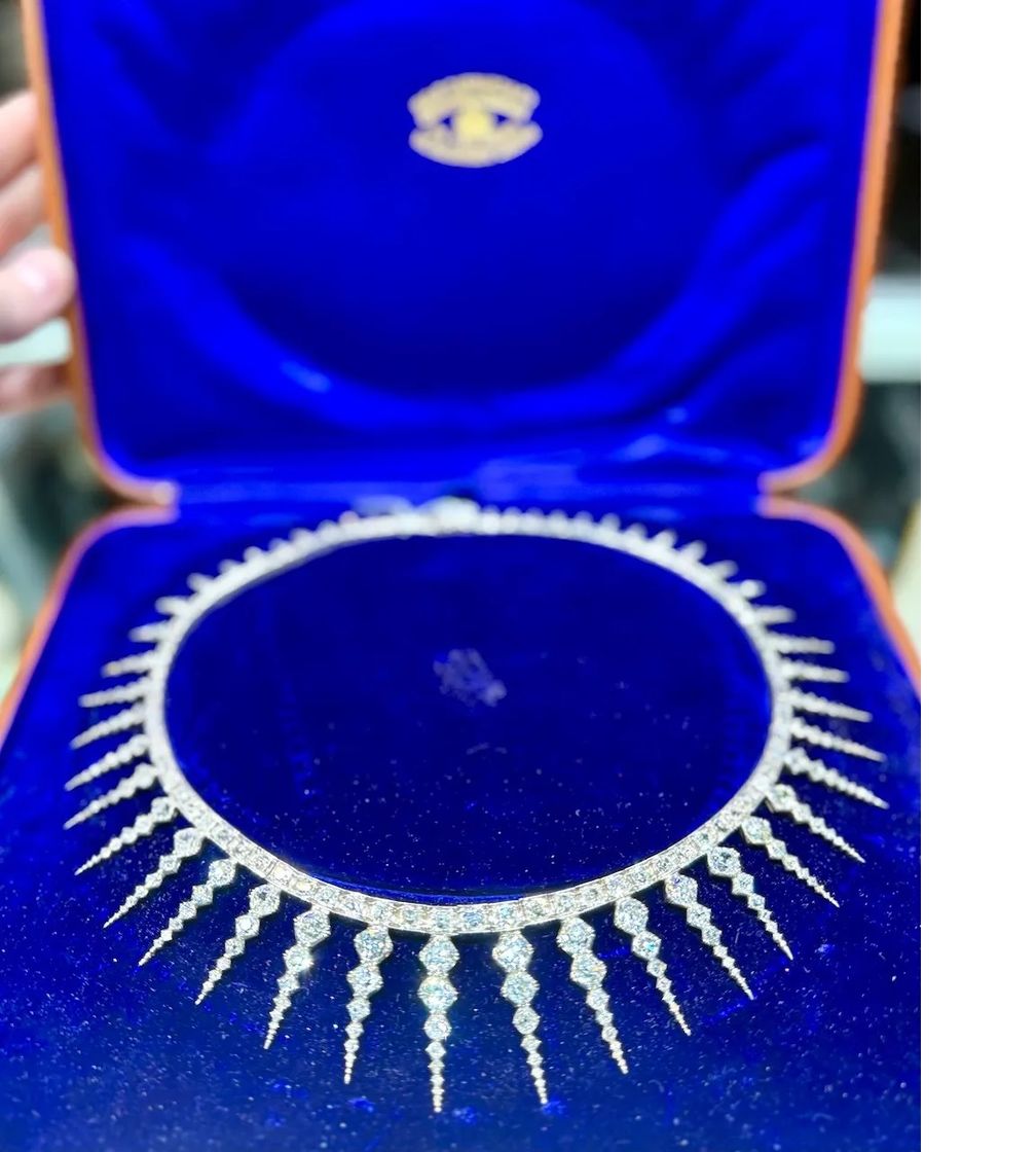 Антикварное бриллиантовое колье, которое превращается в тиару. В дизайне колье Russian fringe сочлененный ряд бриллиантов старой шахтной огранки украшен бахромой из сорока восьми градиентных бриллиантовых «шипов» общим весом около 45,50 карата. Изготовлено в 1890 году компанией Garrard.