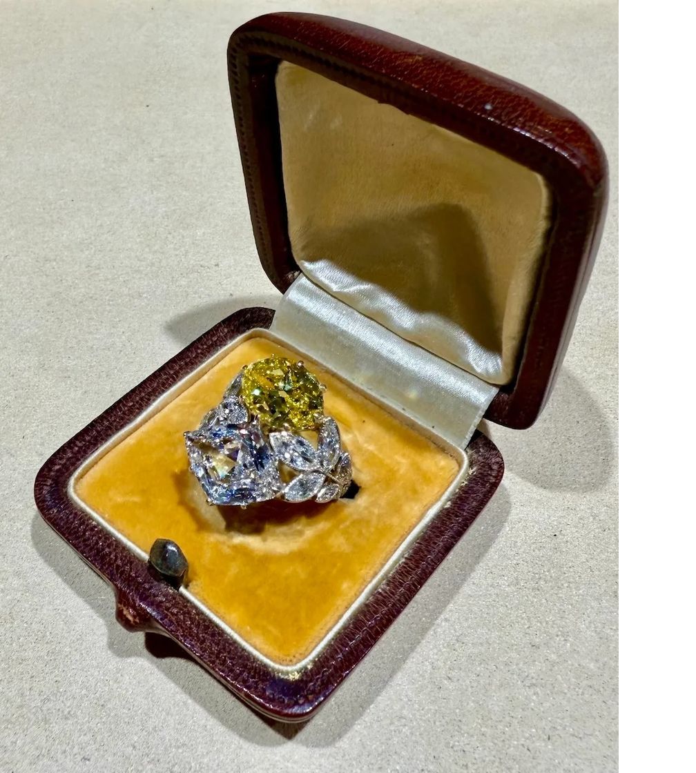 Антикварное кольцо с бриллиантами в удивительно современном дизайне Toi et Moi, созданном в эпоху Belle Époque в конце 19 века. Оно украшено природным овальным бриллиантом фантазийного ярко-желтого цвета, весом 3,74 карата и природным бриллиантом ромбовидной огранки, весом 3,52 карата, цвета D в белом и желтом золоте.