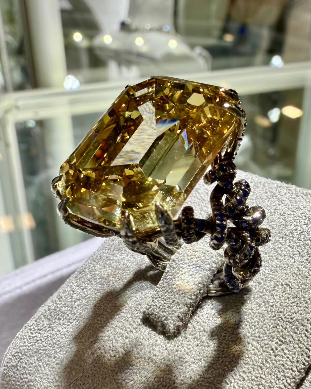 Современное кольцо от Spectra Fine Jewelry с фантазийным темно-коричнево-зеленовато-желтым бриллиантом огранки изумруд, весом 33 карата в центре и ободком с синими сапфирами.