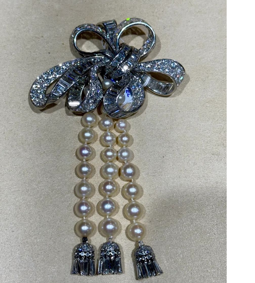 Брошь украшена бантом из бриллиантов огранки багет и круглых бриллиантов, тремя нитями жемчуга, каждая из которых увенчана кисточкой из круглых бриллиантов и бриллиантов огранки багет.