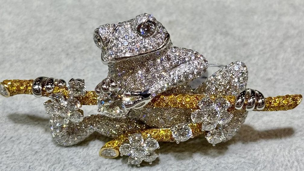 Единственная в своем роде бриллиантовая брошь Frog, изготовленная компанией Graff в начале 2000-х годов. Лягушка полностью украшена бесцветными бриллиантами, висит на ветке из природных желтых бриллиантов и держит бесцветный круглый бриллиант весом 3,37 карата.