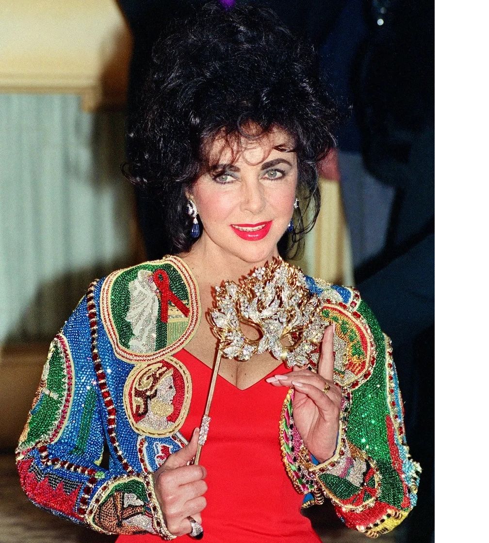 Элизабет Тейлор держит бриллиантовую маску для фотографов на аукционе ювелирных изделий 13 апреля 1992 года в пользу Американского фонда исследований СПИДа (AmFar). Маска оценивается более чем в миллион долларов США (Getty Images):