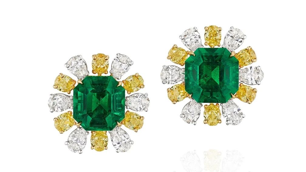 Серьги-клипсы украшены колумбийскими изумрудами огранки изумруд, весом 5,15 и 5,59 карата, обрамленными чередующимися бриллиантами с желтым оттенком овальной формы и белыми бриллиантами грушевидной формы. Украшение будет продано на аукционе по цене до $ 300 000.