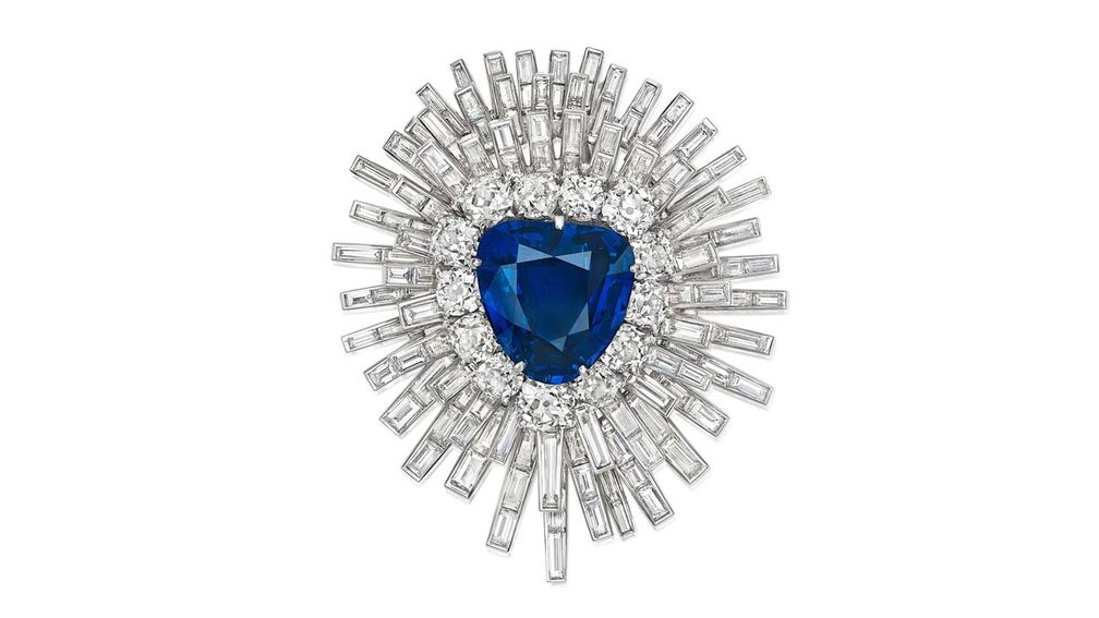 В центре этой броши – бирманский сапфир грушевидной формы, весом 20,82 карата, обрамленный бриллиантами старой европейской и старой шахтной огранок, в съемной оправе, украшенной бриллиантами огранки багет. Предварительная максимальная оценка составляет $ 300 000.