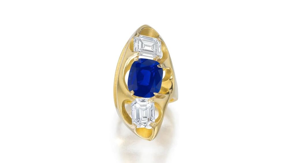 Кольцо с кашмирским сапфиром «королевского синего» цвета, огранки кушон, весом 6,92 карата в ажурной оправе, украшенной двумя бриллиантами огранки изумруд весом 2,34 и 2,62 карата, оценивается в $ 500 000.