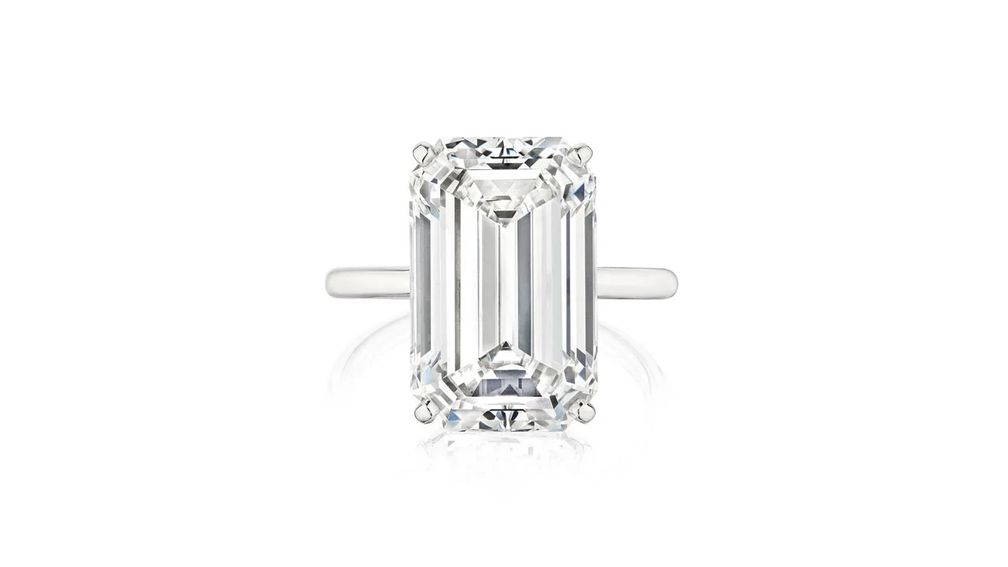 Это кольцо от Tiffany & Co. с безупречным бриллиантом цвета D, огранки изумруд, весом 10,08 карата имеет предварительную максимальную оценку $ 550 000.