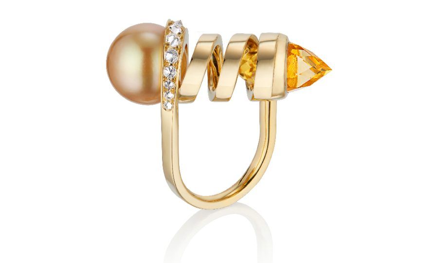 Экстравагантное кольцо от Renisis из 18-каратного желтого золота украшено перевернутыми бриллиантами, золотой жемчужиной Южного моря и ограненным цитрином в форме пули: