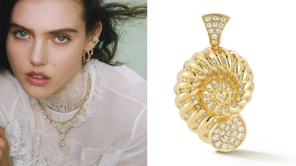 Модель носит золотые и бриллиантовые украшения Renna; подвеска Nautilus (Renna):