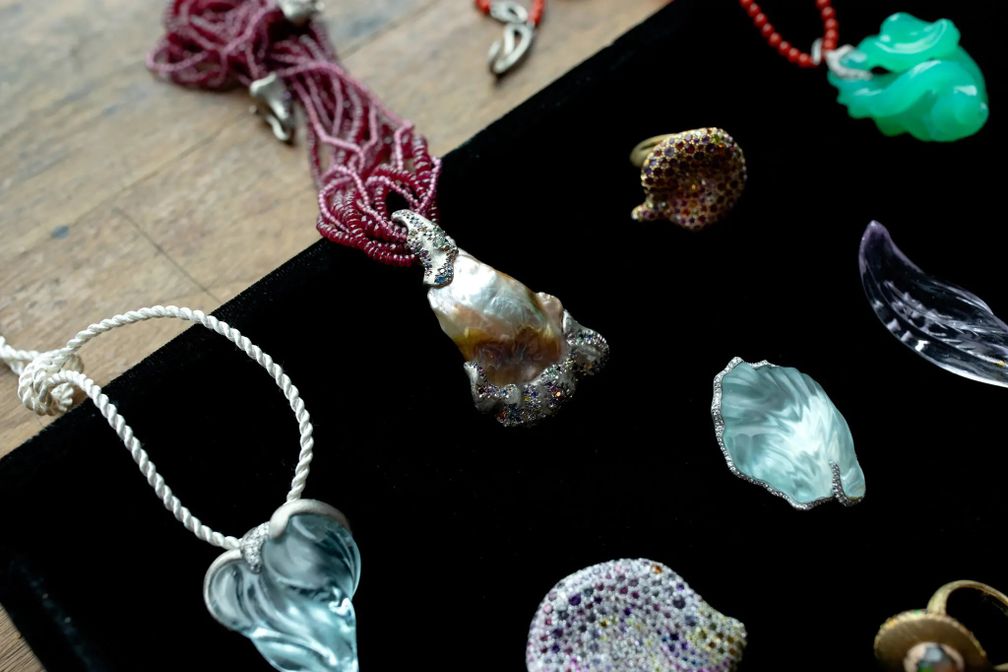 По ее словам, Мунштайнер научил ее видеть красоту во включениях, естественных трещинах и изъянах, встречающихся во многих драгоценных камнях, и теперь она часто делает их центральными элементами своих творений.