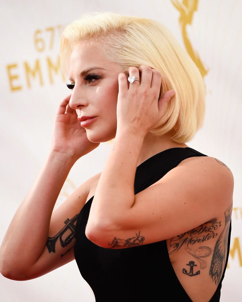 Леди Гага на церемонии вручения премии «Эмми», которая состоялась 20 сентября 2015 года в Лос-Анджелесе, Калифорния. В том же году Тейлор Кинни сделал предложение Леди Гаге, подарив ей помолвочное кольцо с бриллиантом в форме сердца, созданное Лоррейн Шварц (Getty Images):