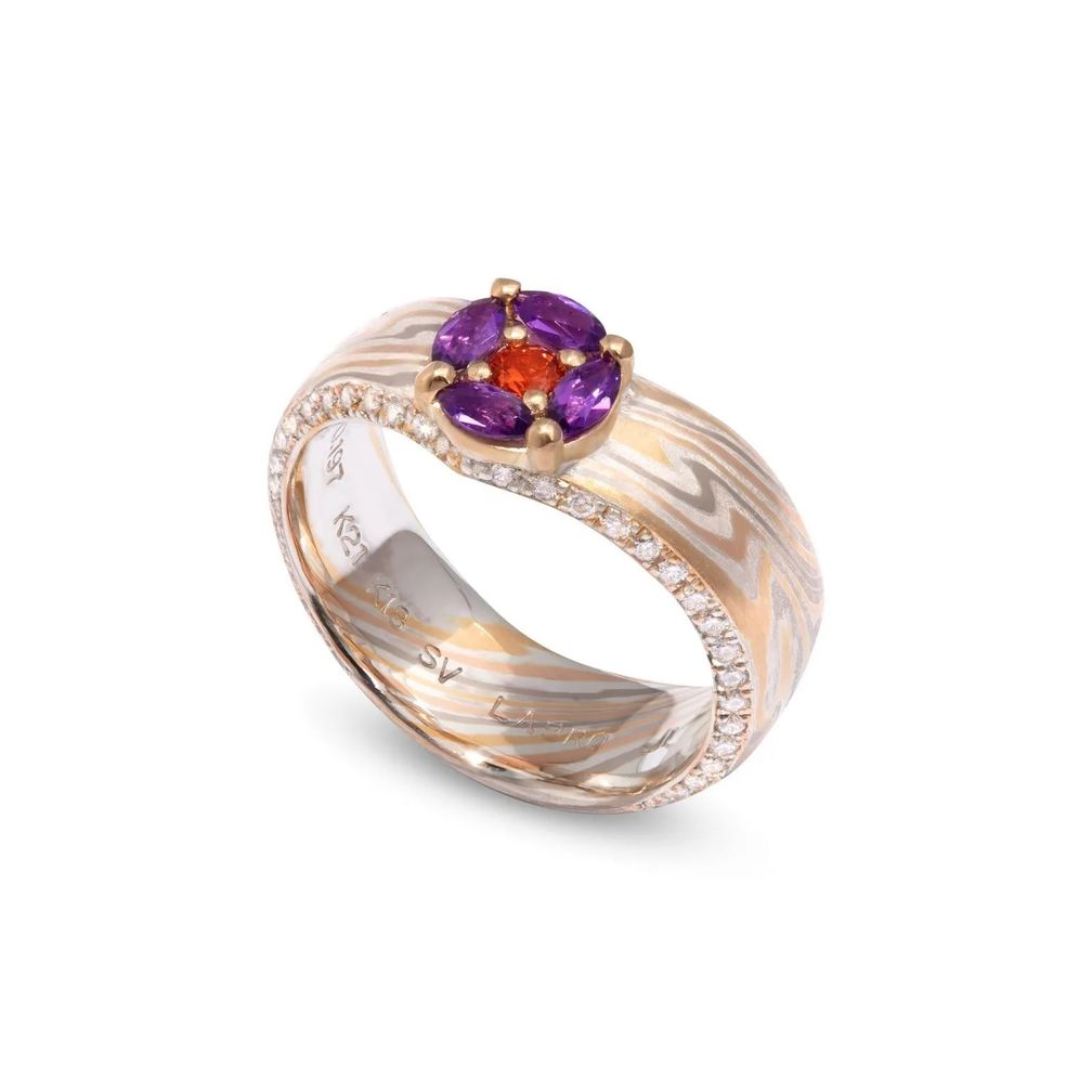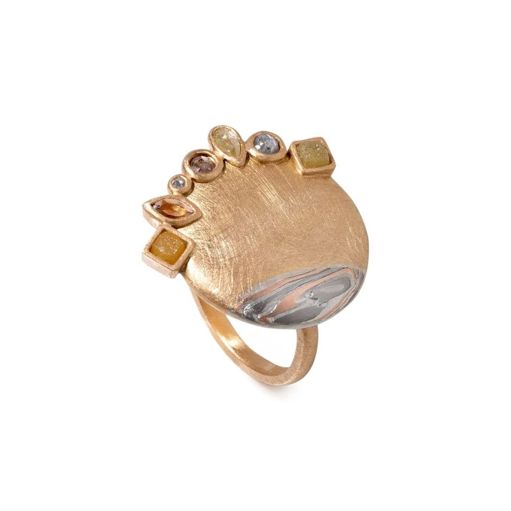 Кольцо Eclipse от Jaume Labro выполнено из уникального сочетания высококонтрастных материалов, с элементом из желтого золота, который с одной стороны служит основой для цветных и необработанных бриллиантов, а с другой – основой для образца японского искусства мокумэ-ганэ: