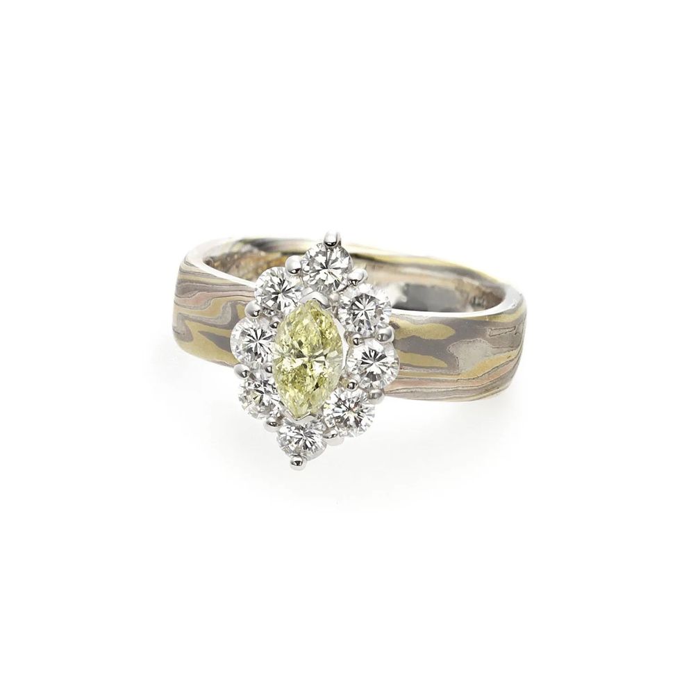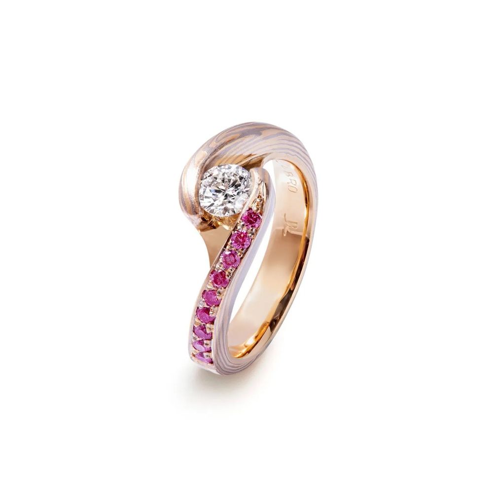 Настоящее воплощение стиля помолвочного кольца, вдохновленного природой, – дизайн кольца Lea Curved Mokume Gane от Jaume Labro струится подобно реке, отражая органичное движение мира природы: