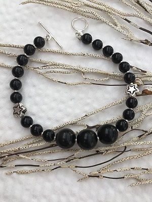 Обсидиан принадлежит стихии Земля, поэтому он идеально сочетается с самоцветами этой стихии: нефрит, агат, яшма, бирюза. Обычно эти самоцветы встречаются в мужских и женских браслетах и бусах.