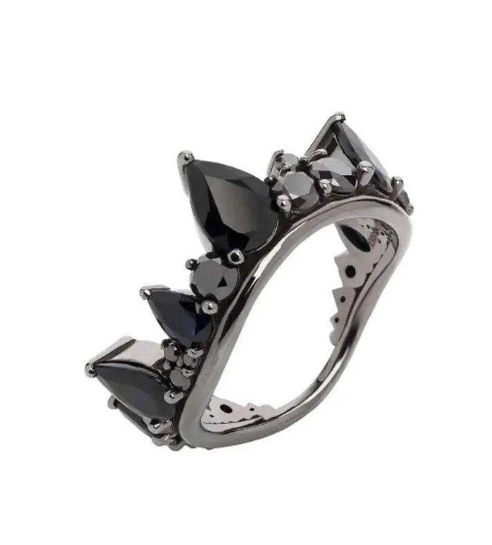 Кольцо Electric Crown из коллекции бразильского ювелирного дизайнера Фернандо Хорхе воспевает роскошь и грандиозность, используя в своем дизайне не только черные бриллианты, но и черные сапфиры. Кольцо из 18-каратного золота кажется украшением, которое могло бы появиться в сериале «Дом дракона».