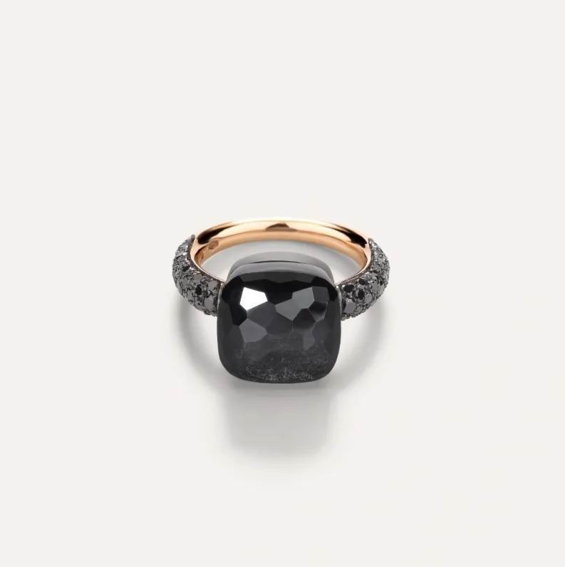 Кольцо Nudo Maxi от итальянского ювелирного Дома Pomellato воплощает ночную атмосферу в очаровательном дизайне. В кольце сочетается красота непрозрачных черных бриллиантов, которые контрастируют с блестящим обсидианом, расположенным в центре кольца.