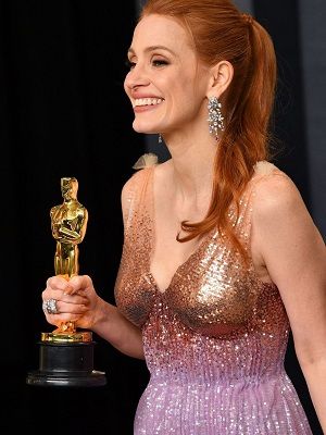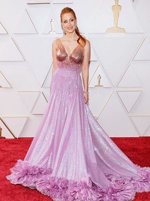 Стоит начать с обладательницы «Оскара» Джессики Честейн. В ее образе было все продумано до мелочей. Для церемонии она выбрала платье с миндально-лавандовым градиентом от Gucci. Наряд был полностью расшит блестками и пайетками, поэтому актриса использовала минимум украшений.