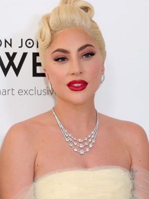 В последнее время Леди Гага радует поклонников нежными и женственными образами. Сначала певица предстала в черном костюме с пайетками, а на вечеринке появилась в роскошном платье цвета шампань. Образ был дополнен комплектом украшений Tiffany & Co. В него вошли: платиновый браслет, сережки и ожерелье с бриллиантами.
