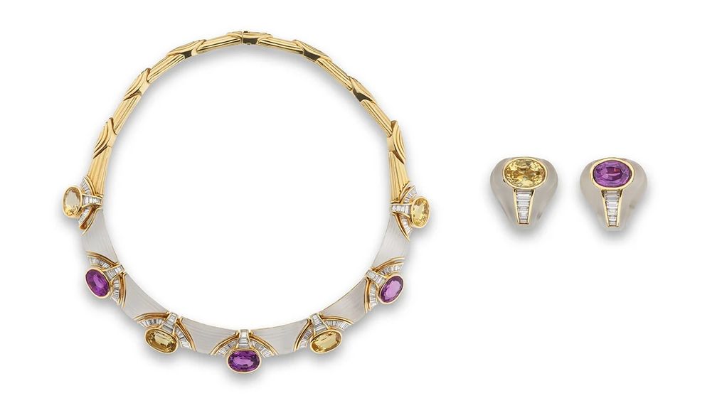 Полупарюра от Bulgari украшена цветными сапфирами, горным хрусталем и бриллиантами.