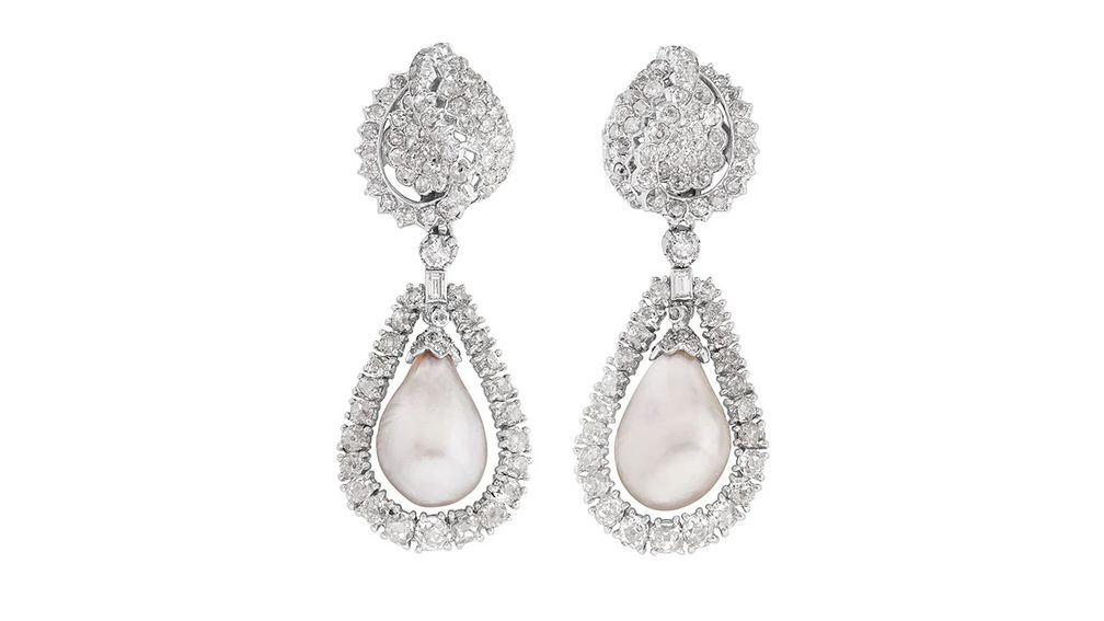 Пара сережек Monture от Cartier, каждая из которых украшена природным жемчугом в бриллиантовом обрамлении.