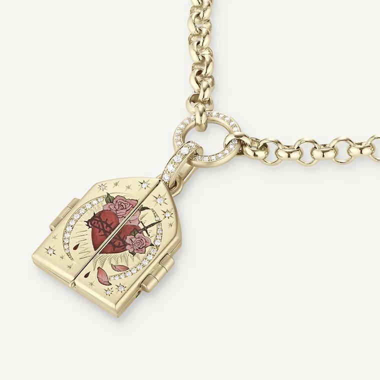 Каждое изделие создается из переработанного 18-каратного золота, вручную гравированного изображениями из мифологии, фольклора и культуры татуировок – пылающими сердцами, змеями, небесными символами и личными эмблемами. С помощью традиционной техники champlevé углубления заполняются эмалью насыщенных цветов и обжигаются в печи, создавая миниатюрные сцены с ярким рельефом. Этот процесс требует кропотливой работы, каждая деталь тщательно вырезается и обжигается несколько раз для достижения глубины и прочности.