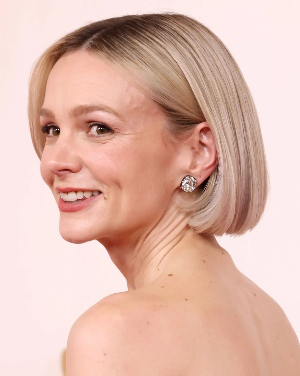 Кэри Маллиган выбрала классический образ на красной дорожке церемонии вручения премии «Оскар» в 2024 году, надев платье Balenciaga и серьги-гвоздики с бриллиантами старой шахтной огранки весом 10 карат каждый от Fred Leighton.