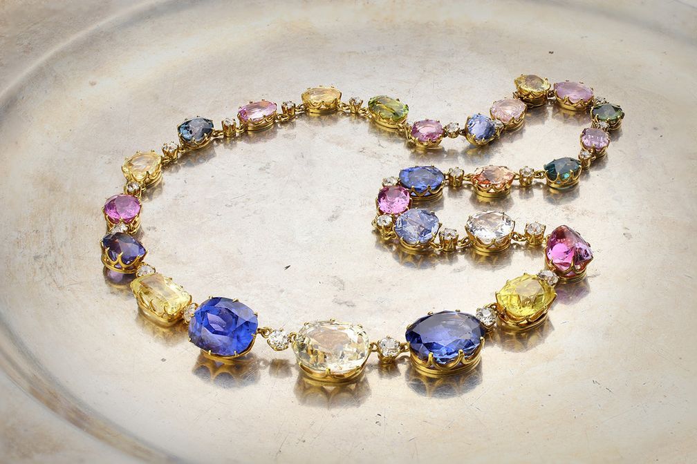 Антикварное ожерелье Harlequin от FD Gallery из золота с цветными сапфирами общим весом 95 карат и бриллиантами старой огранки общим весом 2,5 карата, около 1900 года: