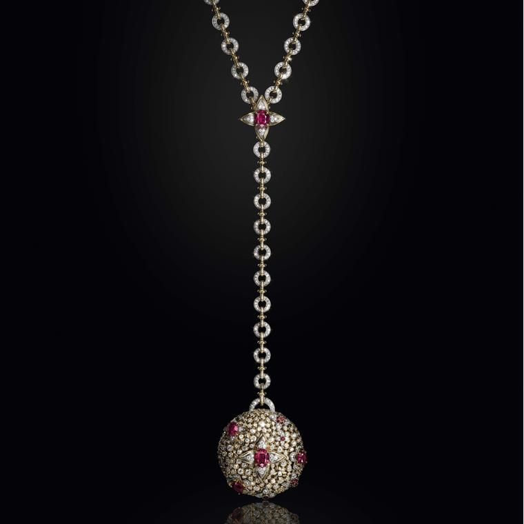 Ожерелье Splendeur с бриллиантами и рубинами навевает мысли об императорских дворцах Парижа и роскошных тканях их интерьеров. Louis Vuitton Awakened Hands Awakened Minds Chapter II 2025: