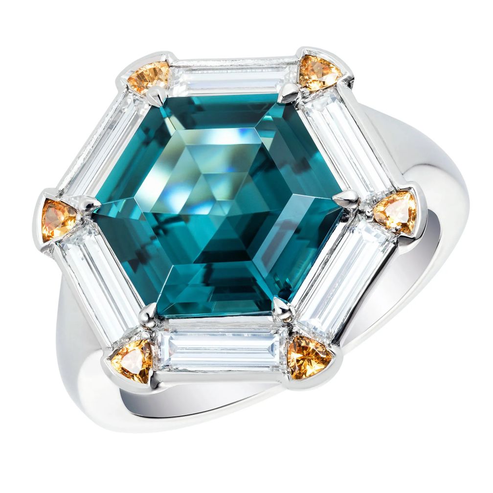 А лондонский ювелир Hirsh недавно представил кольцо Keystone Tourmaline из платины с индиголитом весом 3,84 карата. Чтобы подчеркнуть шестиугольную форму камня, каждая из его шести сторон была акцентирована крошечными треугольными оранжевыми гранатами.