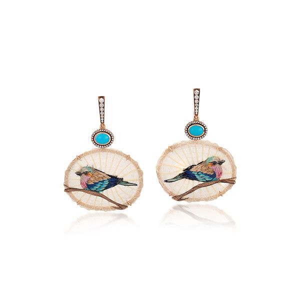 Серьги с вышитой конской гривой, украшенные бриллиантами и бирюзой в 18-каратном желтом золоте