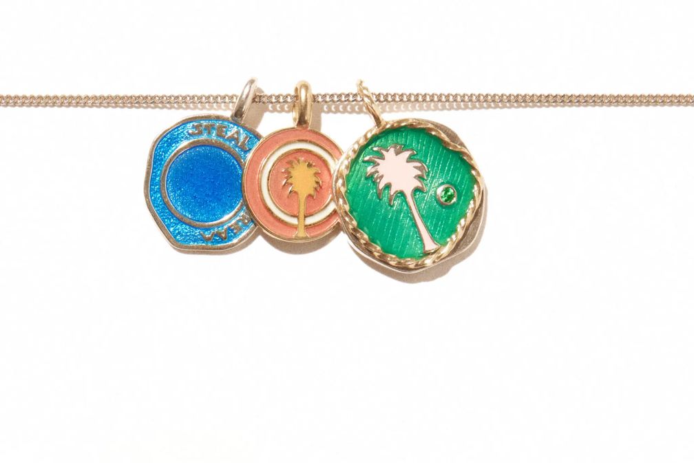 Парижский дизайнер Паскаль Монвуазен говорит, что роспись на ее голубых, розовых или зеленых подвесках из смолы более тонкая, чем кажется. Мало того, что вокруг пальмы, текста (Steal Me A Dream) и среди кругов есть крошечные пространства для росписи, она также хотела, чтобы смола на ее зеленых и синих кулонах была прозрачной, чтобы такие элементы, как солнечные лучи в нижней части зеленого кулона, были видны.