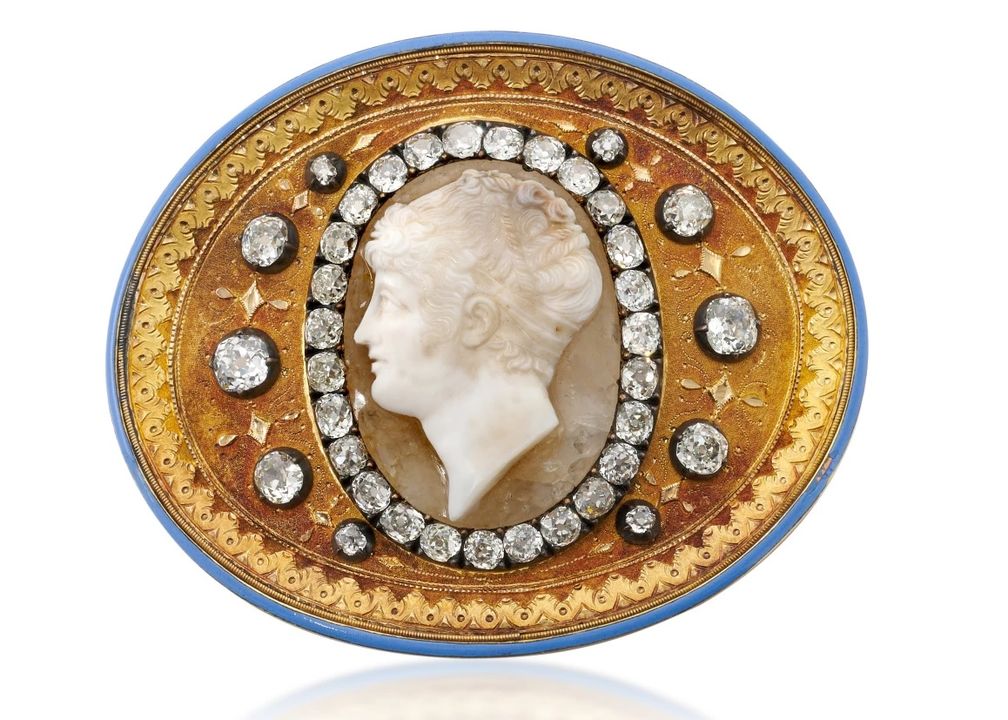 Среди лучших мастеров резьбы по камеям, многим из которых покровительствовала Каролина Бонапарт, такие художники, как Тереза Талани и Филиппо Рега, работавшие в стиле классического возрождения, создавали портреты, а также мифологические фигуры. Это видно на примере одного потрясающего изделия, включенного в продажу. Эта брошь 1810 г., не установленного авторства, представляет собой потрясающий образец агатовой камеи с профилем дамы, окруженным бриллиантами старой шахтной огранки и голубой эмалью.