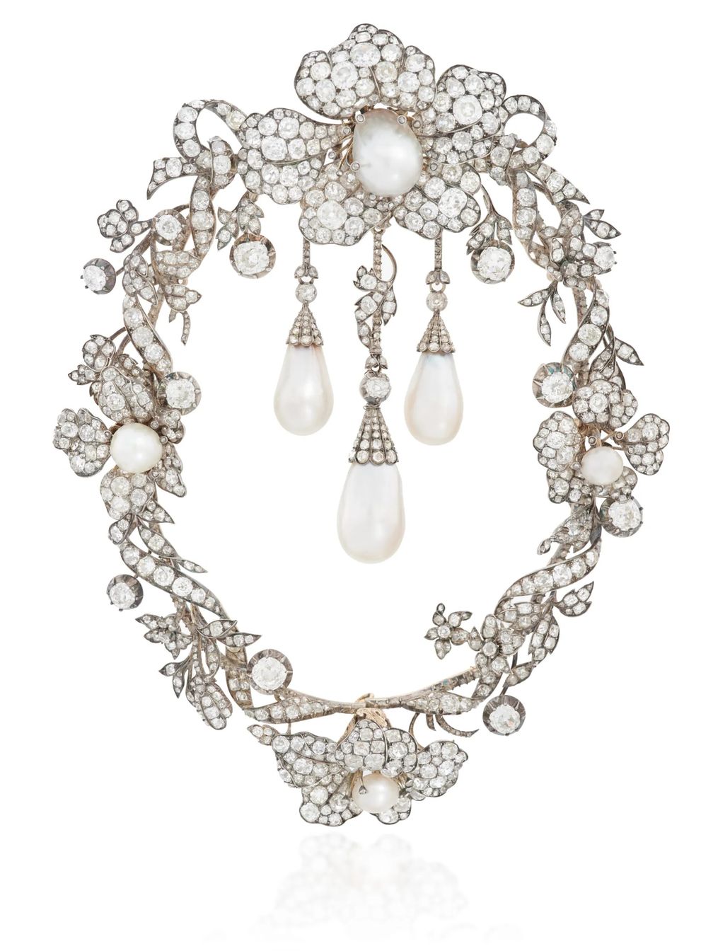 Природный жемчуг господствовал в XIX веке, и в этой коллекции представлено необыкновенное корсажное украшение, выполненное в виде гирлянды из исключительных природных жемчужин и бриллиантов. Подаренное эрцгерцогине Марии Терезии Австро-Тешенской в 1865 г., это украшение является самой значительной драгоценностью XIX в., представленной на аукционе за последние годы.
