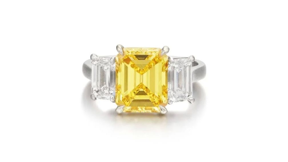 Это кольцо украшено ярко-желтым бриллиантом изумрудной огранки весом 4,20 карата, чистоты VVS2, окруженным парой бриллиантов изумрудной огранки весом 1,08 и 1,07 карата. Его максимальная оценка составляет 220 000 долларов: