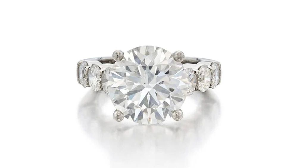Кольцо с круглым бриллиантом цвета E, весом 6,01 карата, чистоты VS2, окруженным круглыми бриллиантами, оценивается в 180 000 долларов: