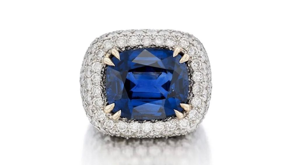 Это кольцо украшено мадагаскарским сапфиром огранки кушон весом 18,18 карат, украшенным круглыми бриллиантами в оправе паве. Его максимальная оценка составляет 180 000 долларов: