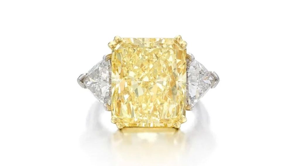 Кольцо с желтым прямоугольным бриллиантом с обрезанными углами, чистоты SI2 и весом 14,32 карата, окруженным парой треугольных бриллиантов, имеет верхнюю оценку в 150 000 долларов: