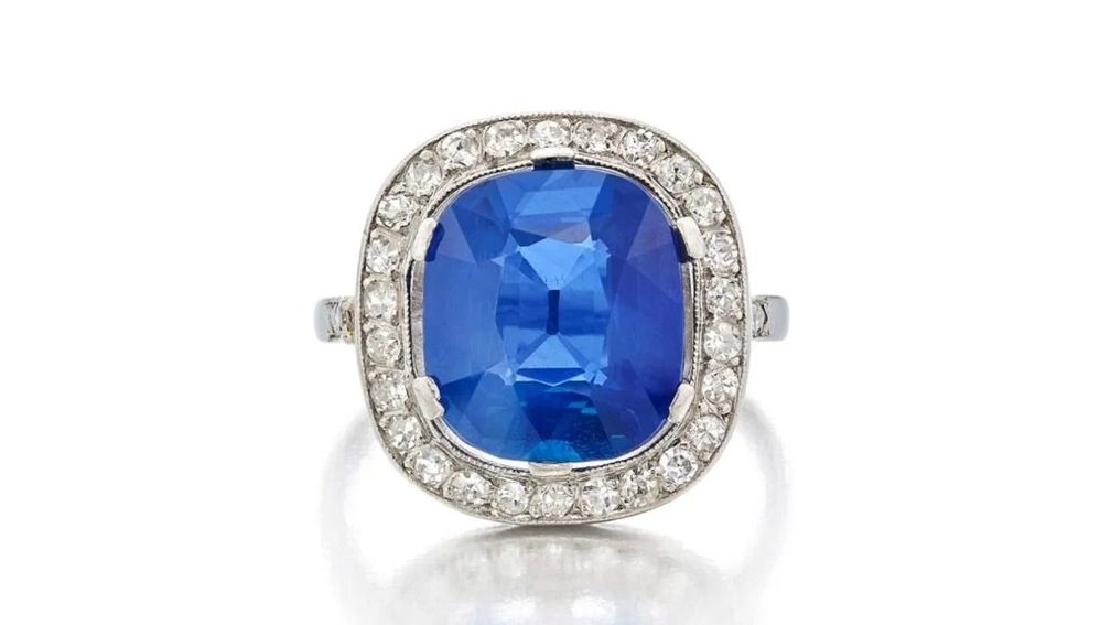 Это кольцо украшено кашмирским сапфиром огранки кушон весом 5,13 карата, окруженным и подчеркнутым бриллиантами одинарной огранки. Его максимальная оценка составляет 150 000 долларов: