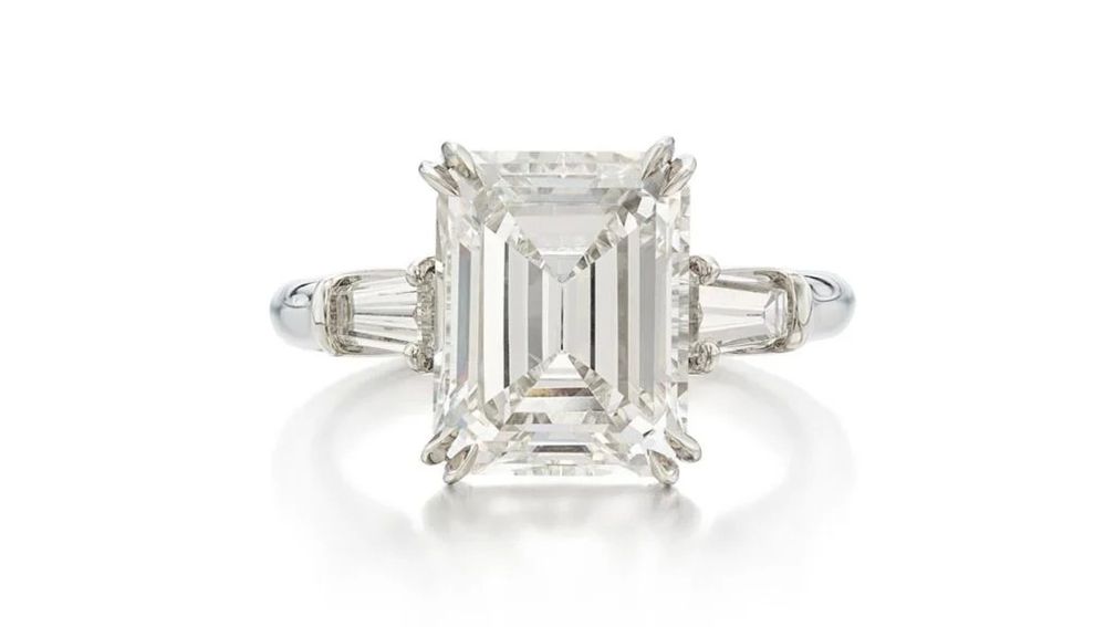 Кольцо от Harry Winston с бриллиантом изумрудной огранки, весом 4,97 карата, цвета E, чистоты VVS2 в центре и коническими бриллиантами багетной огранки имеет максимальную оценку в 140 000 долларов:
